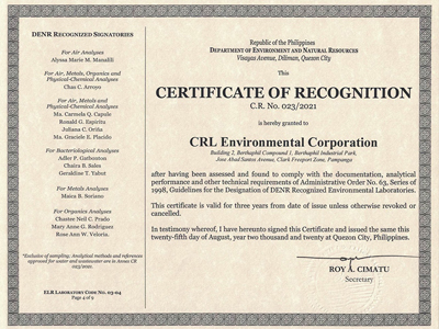 CRL Calabarquez Corporation is a full environmental Air Quality Monitoring company. Its services include stationary source emission testing (stack testing), ambient air quality monitoring, working environment measurement (WEM), indoor air quality monitoring (IAQ), calibration gas audit (CGA), and relative accuracy test audit (RATA). CRL Calabarquez Corporation is part of the CRL Environmental Corporation group which is a full service environmental analytical testing laboratory